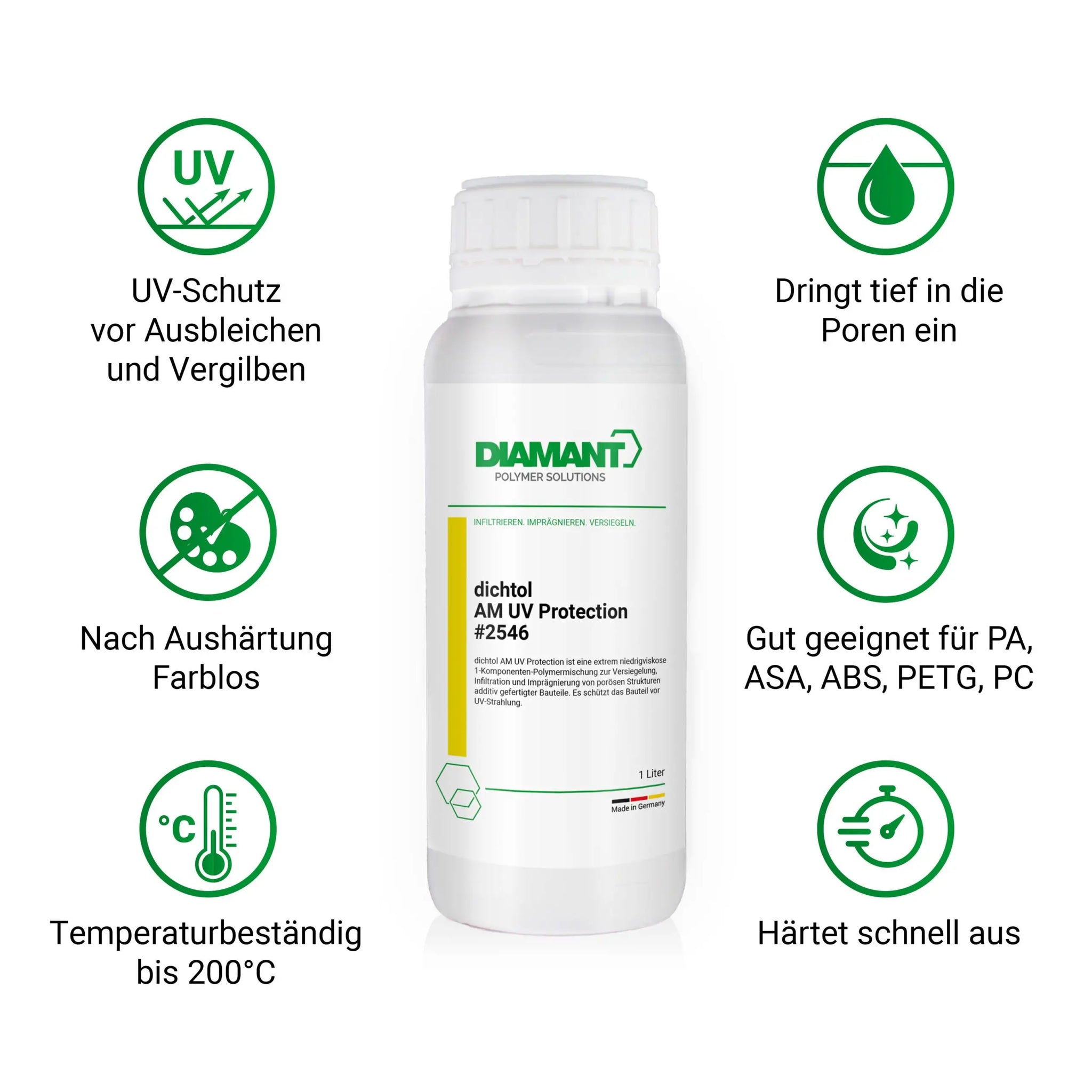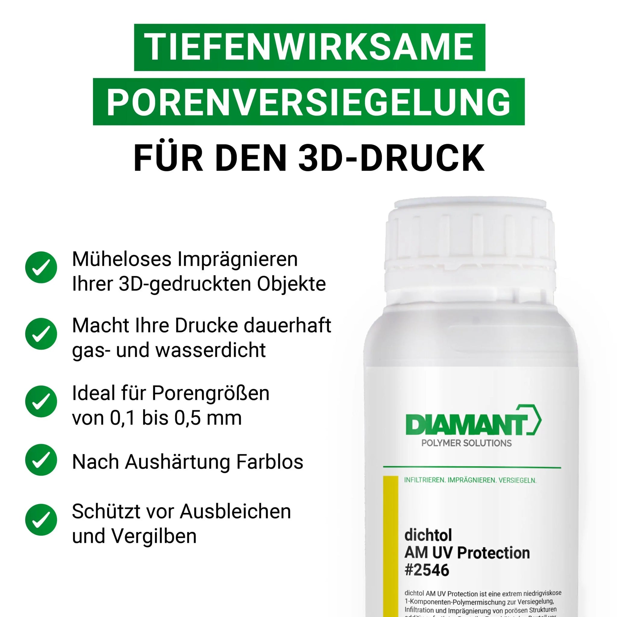 dichtol AM UV Protection ist ein gebrauchsfertiges Polymersystem zur Versiegelung von additiv gefertigten Bauteilen. Der lösemittelbasierte Versiegler bringt neben der Abdichtung einen zusätzlichen UV-Schutz mit ein und schützt dadurch das Druckmaterial und unterliegende Farben vor dem Einfluss der UV-Strahlung. Mit dem Versiegler können additiv gefertigte Bauteile gegen verschiedene Flüssigkeiten und Gase abgedichtet und vor Umwelteinflüssen geschützt werden. Der Versiegler kann für alle gängigen Druckverfahren und Druckmaterialien verwendet werden.