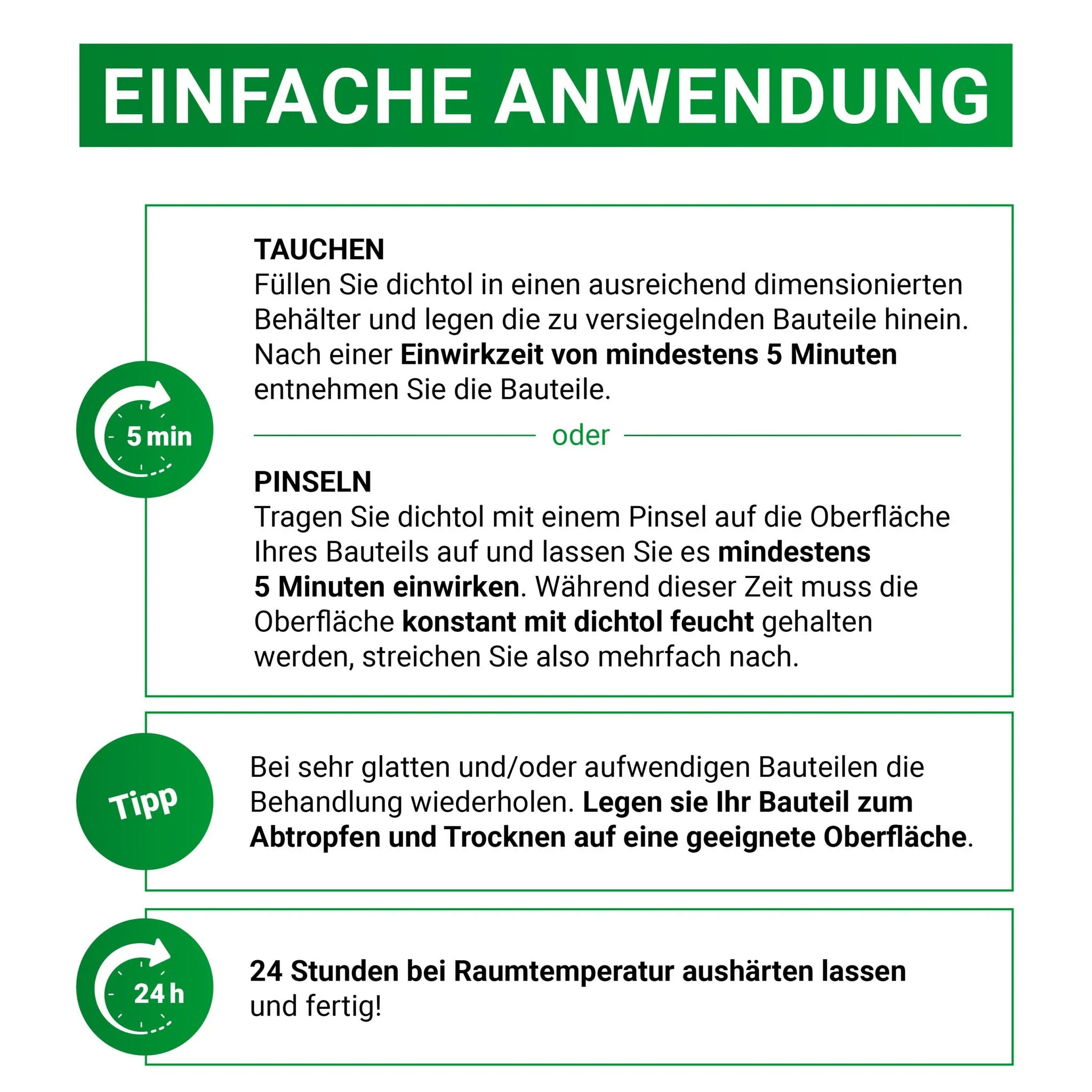 Dieses Verfahren eignet sich besonders für kleine und komplexe Bauteile, die gleichmäßig versiegelt werden sollen.Füllen Sie den Versiegler in einen ausreichend dimensionierten Behälter und legen die zu versiegelnden Bauteile hinein. Nach einer Einwirkzeit von ca. 5 Minuten entnehmen Sie die Bauteile und legen sie zum Abtropfen und Trocknen auf eine geeignete Oberfläche.